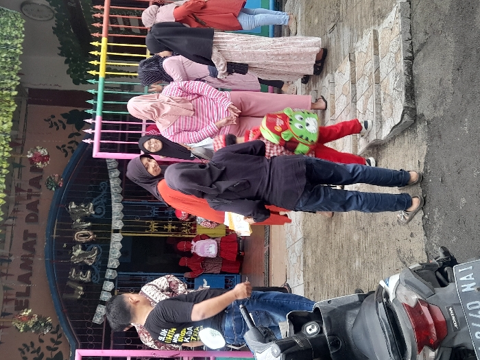 A group of people stands in front of a building with a sign that says "SELAMAT DATANG." Most are wearing hijabs and casual clothing. One person is wearing a bright red and green outfit. The building is decorated with colorful gates and flower decorations. A person is sitting on a motorcycle in the foreground. The scene appears to be outside a school or daycare center.
