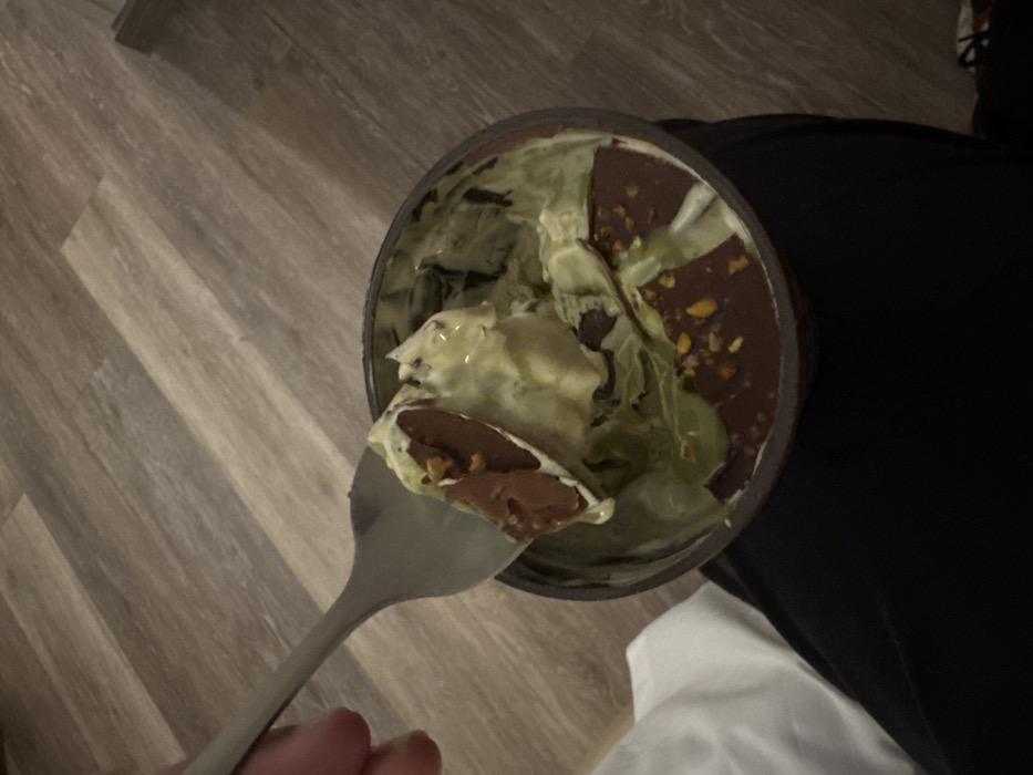 An overhead, close-up image depicts a person consuming ice cream in Zevenbergen, Netherlands. A light-skinned hand holds a silver spoon, which contains a scoop of light green ice cream and a broken piece of solidified dark chocolate. The spoon is positioned over a dark-colored pint container, revealing partially consumed ice cream. The container's contents consist of light green ice cream interspersed with significant fractured layers of dark chocolate. Visible within the chocolate are scattered orange/brown particulate elements, consistent with chopped nuts or candy. A portion of a white garment is visible on the lower left, adjacent to dark-colored clothing, indicating the consumer's attire. The background consists of a light-toned wooden floor with visible plank lines.