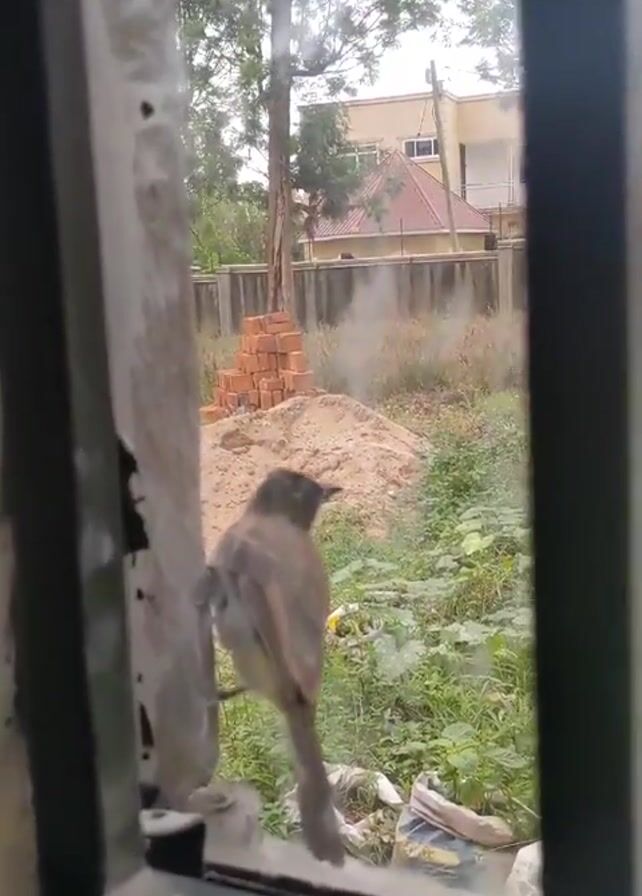 Through the window of a building, a bird perched on the window frame, looking at the yard. The yard has a pile of bricks, some sand, and green plants. Beyond the yard, a tall building is visible.