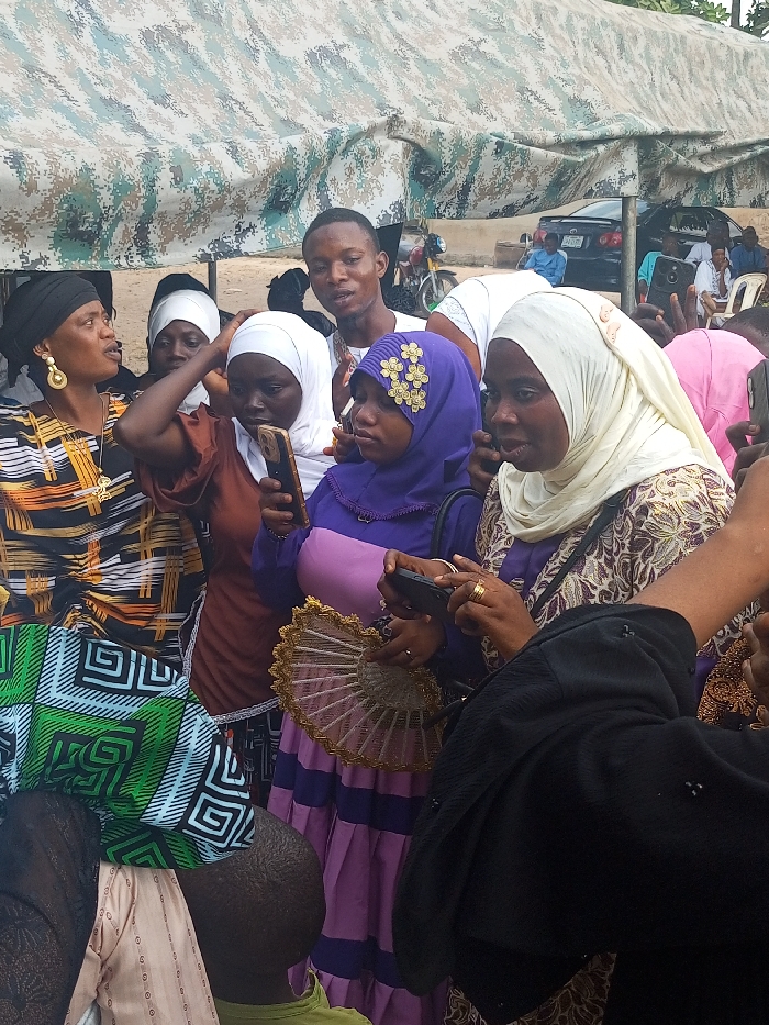 The scene depicts a group of individuals gathered outdoors in Erin-osun, Nigeria, under a camouflage-patterned canopy. The foreground features approximately seven adults and one child. From left, a woman in a black headwrap and patterned orange, black, and white top, adorned with a large gold circular earring and a gold crucifix-like pendant, is seen with her mouth open. Next, a young woman in a white hijab and brown top holds a light-colored smartphone vertically with both hands, focused on its screen. Behind her, a young man in a white t-shirt with an earring looks slightly upwards and to the right, his mouth open. To his right, a young woman in a purple hijab embellished with gold floral appliqués and a two-toned purple dress holds a smartphone horizontally in both hands, looking at its screen, and a decorative, semi-circular fan with a gold trim. Adjacent to her, a woman in a cream-colored hijab and patterned dress holds a dark-colored smartphone horizontally, viewing its screen, displaying gold rings on her right hand. A person in a black garment is partially visible on the far right. A child's dark-skinned head in a green top is visible in the lower foreground. In the background, a black sedan (license plate partially visible as 'RV 430...') and a motorcycle are parked on a dirt surface. Several other individuals are visible seated or standing further in the background.