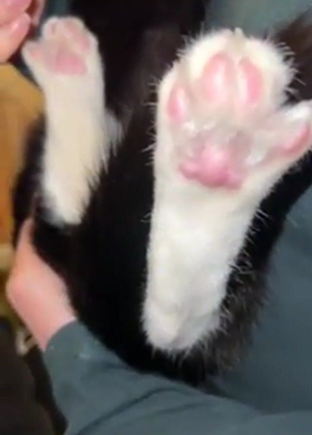 person holding a black and white cat belly-up, showing off its paws with pink toe beans