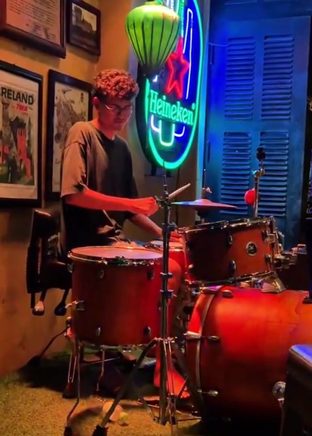 A young man plays a drum set in an indoor venue, possibly a bar
