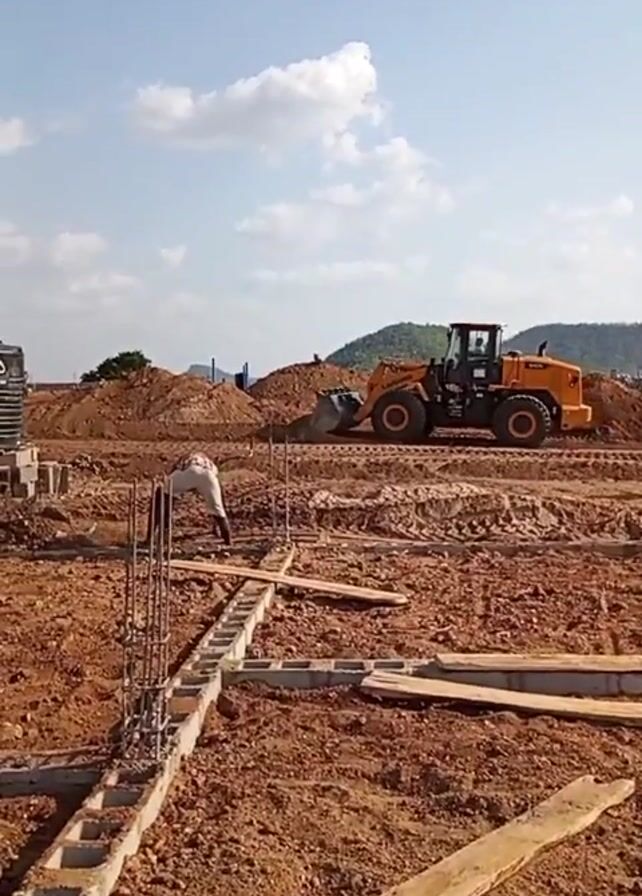 construction site on a sunny day. A man wearing light-colored clothing is working on the foundation, which consists of concrete blocks with rebar sticking out. Wooden planks are lying on the red dirt around the foundation. In the background, an orange front-end loader is moving dirt, creating a pile. The sky is blue with scattered white clouds. A hill can be seen in the distance.