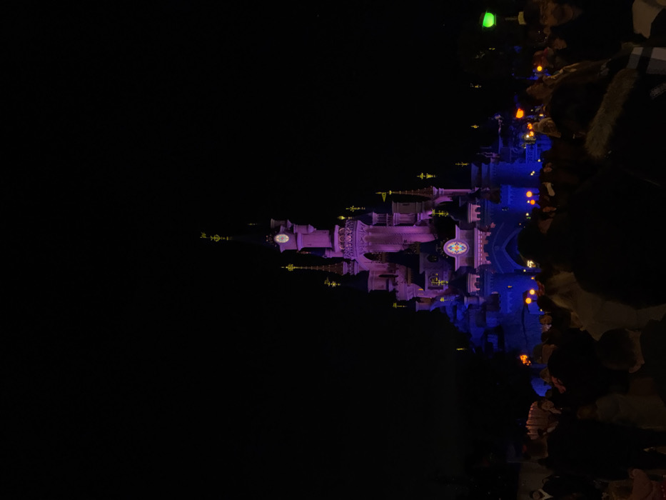 The image displays Sleeping Beauty Castle at Disneyland Paris in Chessy, France, illuminated at night. The castle's upper spires and turrets are bathed in purple and pink light, while its lower sections and archways exhibit blue illumination. Gold-colored lights accent architectural features across the structure, including a visible clock face on a central tower. A large crowd of individuals, primarily silhouetted, occupies the foreground, facing towards the castle. Several orange globe-shaped lights are visible within the crowd area in the mid-ground, and a distinct green light source is present on the far right. The sky overhead is completely dark.