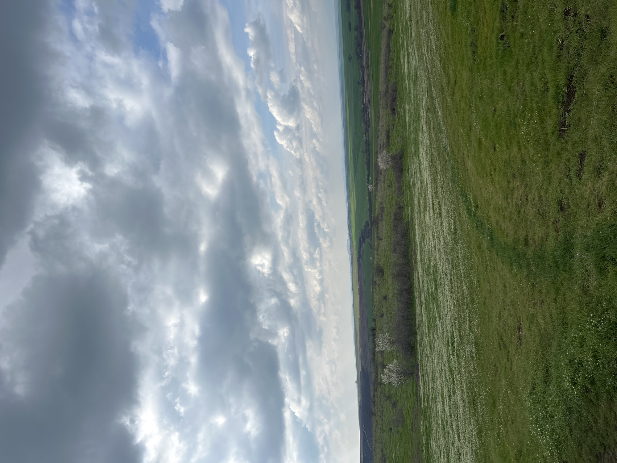 The image depicts a landscape in Irechekovo, Bulgaria, featuring a green field with a boundary of shrubs or trees. The field appears to be covered in grass, with some patches of what might be wildflowers scattered throughout. A strip of different colored vegetation runs parallel to the edge of the field, separating it from another field. The sky occupies a significant portion of the image, showcasing a cloudy sky with patches of blue visible through the cloud cover.