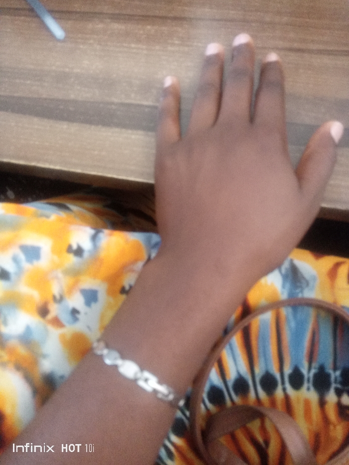 The scene depicts a close-up, downward view of a person's right hand and forearm resting on a light brown, wood-grain patterned surface in Dabawa, Nigeria. The skin tone is dark brown, and the fingernails are light-colored. A silver-colored bracelet composed of interconnected links is worn on the wrist. Below the arm, a patterned fabric, possibly clothing, displays an abstract design featuring hues of orange, yellow, blue, and dark grey. A curved, brown object, likely a strap from a bag or footwear, is partially visible in the lower right, overlapping the patterned fabric. A thin, light-colored object, possibly a pen, is partially visible in the upper left on the wooden surface. The device watermark "Infinix HOT 10i" is present in the lower left corner.
