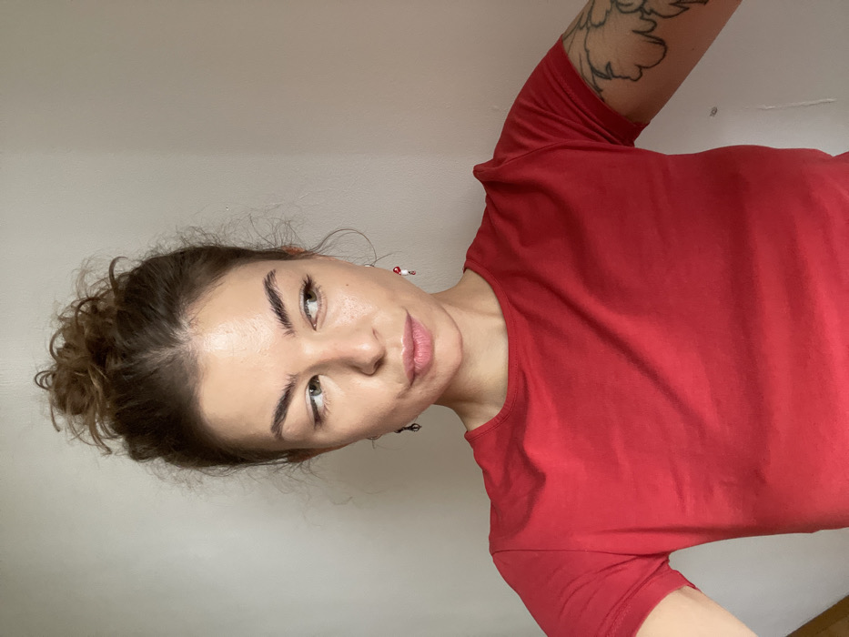 A female individual, estimated to be in her 20s or 30s, is depicted in a chest-up, front-facing portrait. Her medium-brown hair is pulled into a messy bun on top of her head. She possesses a fair complexion, full lips, and well-defined eyebrows. Her gaze is directed towards her left (viewer's right). She is wearing a plain, short-sleeved red t-shirt. Two distinct dangle earrings are visible: a dark-colored, possibly black or very dark red, beaded earring is in her left ear (on the viewer's right side of the image), and a red and white mushroom-shaped earring is in her right ear (on the viewer's left side of the image). A partial black outline tattoo, featuring floral or organic patterns, is visible on her left bicep/shoulder area (on the viewer's right side). The background consists of a plain, uniformly lit, off-white or light gray wall, with a subtle vertical seam or shadow on the right side. No discernible architectural or environmental features are present to determine a specific location within Boreti, Montenegro.