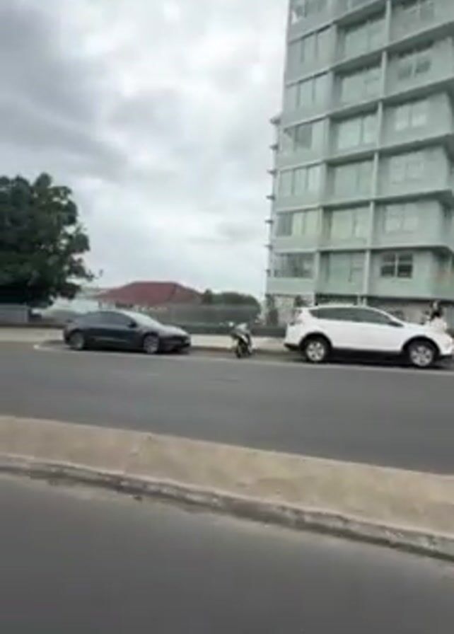 The video opens with a street scene with a tall, modern building in the background under a cloudy sky. A white SUV and a white van are parked on the side of the road. The camera then pans to the left, showing a row of cars parked along the street, including a dark grey sedan. A person wearing a black helmet and riding a black scooter then comes into view. The camera's perspective appears to be from the point of view of the scooter rider. The rider turns the scooter and appears to drop the camera as the view goes dark. The camera then abruptly shifts, facing upward toward the cloudy sky and the building.