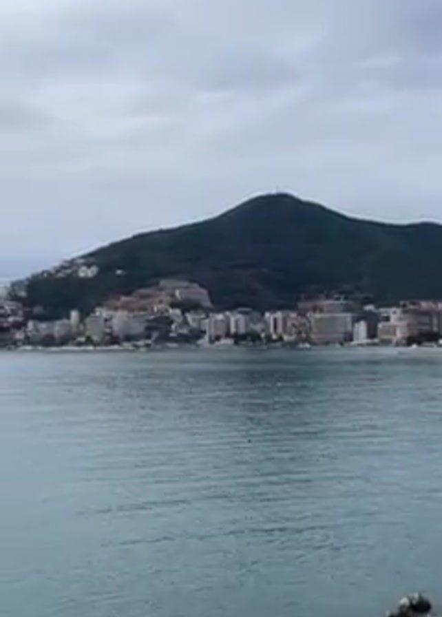 The video depicts a view of a coastline under a cloudy sky. The calm, blue-green water dominates the foreground, with a few small rocks visible in the lower right corner. Across the water, a coastal city is nestled at the foot of a large, green hill. The city consists of numerous buildings, including hotels and apartments, stretching along the coastline and up the slope of the hill. A communication tower is visible on top of the hill. The horizon is obscured by the overcast sky, creating a muted and tranquil scene. The camera slowly pans from right to left.