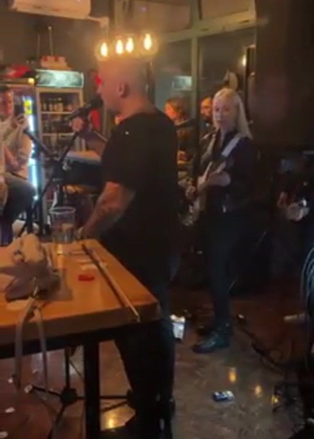 A low-angle, medium shot shows a small band performing in what appears to be a bar or club. A bald man with a microphone stands behind a wooden table, singing. A woman with long blonde hair stands to his right, playing a guitar. Several other people are visible in the background, some holding drinks and observing the performance. The bar is dimly lit, with bare-bulb light fixtures hanging from the ceiling. There are speakers and other musical equipment visible on the floor. The overall environment suggests a relaxed, informal live music setting.