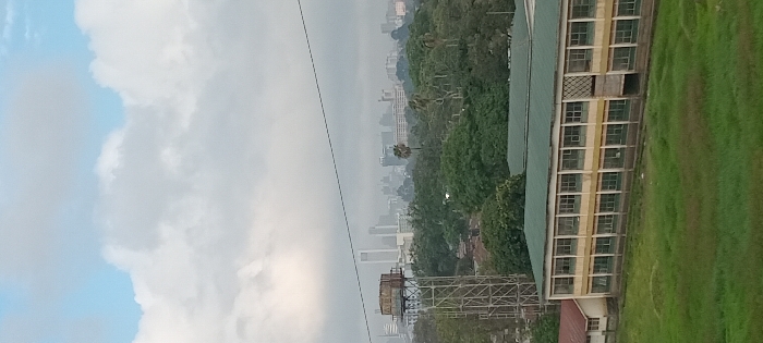 A landscape featuring a cloudy sky, a cityscape obscured by haze, and lush greenery. A multi-story building with numerous windows abuts a grassy field. A tall, metal water tower stands out in the foreground, while a power line crosses the sky. The overall scene conveys a sense of urban development integrated with nature under an overcast sky.