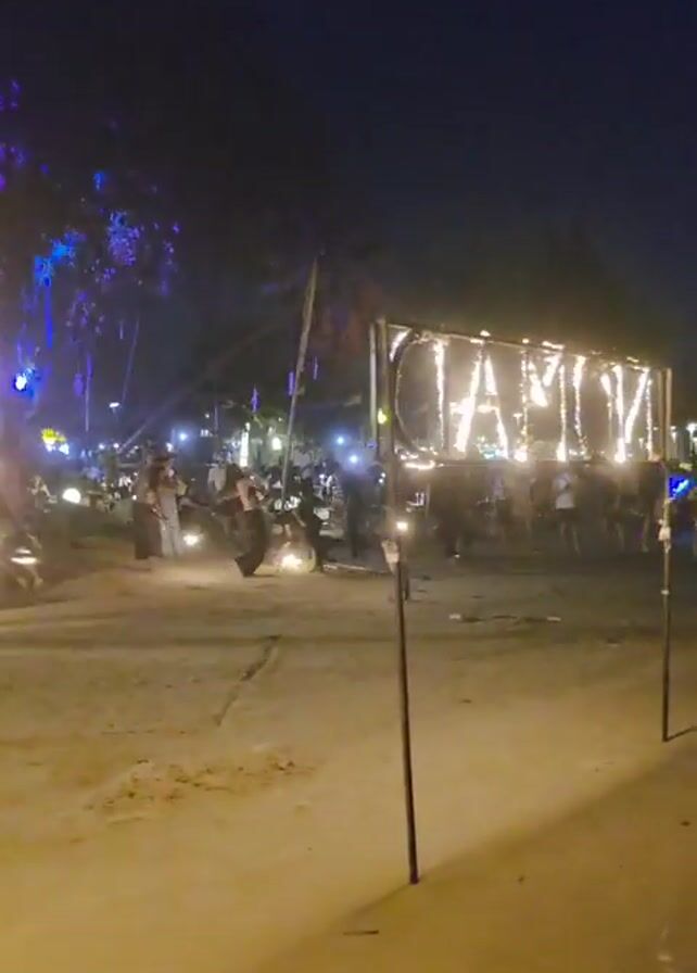 n outdoor scene at night. A large sign that reads "CLAIMON" is illuminated with lights. A crowd of people is visible in the background, some seated around tables and others walking around. There are also fires burning in the foreground, and the ground appears to be sandy. A man walks from left to right in front of the camera, toward the crowd.