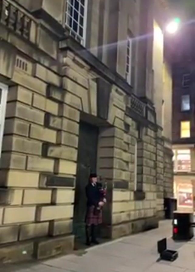 A man dressed in traditional Scottish attire is playing the bagpipes on a city street at night