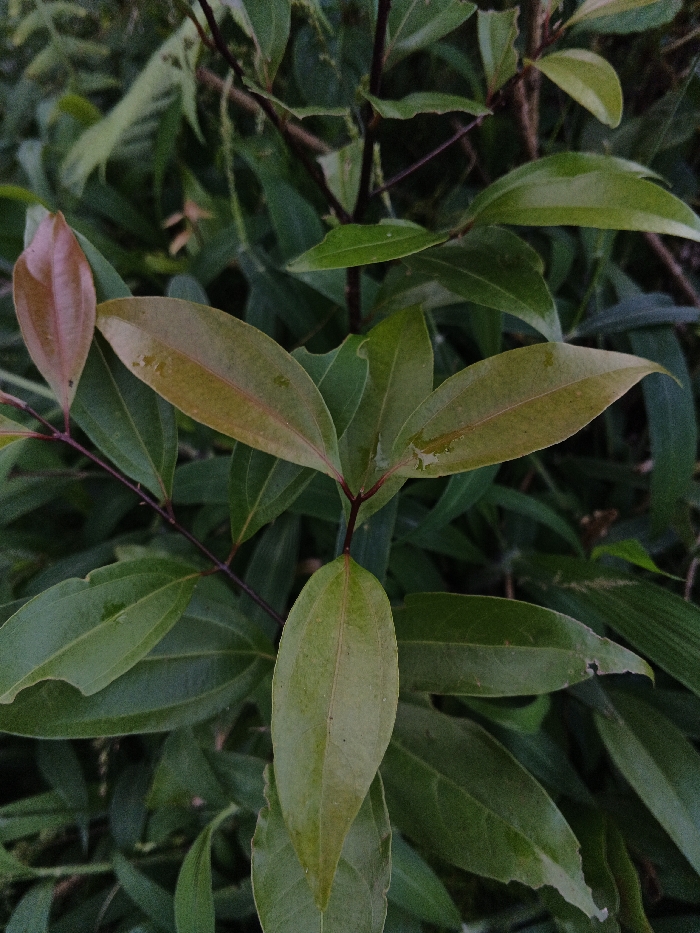A close-up, vertical photograph taken in the city of Unknown, Cambodia, depicts a dense cluster of plant foliage. The central focus is a system of slender, dark reddish-brown stems from which numerous leaves emerge. These leaves exhibit varied coloration, with mature leaves appearing dark green and younger leaves displaying reddish-brown to golden-green hues. The leaves are generally lanceolate to ovate in shape, with smooth or slightly irregular margins, and several show visible central veins. Multiple small, clear water droplets are present on the surfaces of several leaves. The background consists of heavily blurred, dense green foliage, indicating a natural, verdant environment. No human subjects, animals, or artificial objects are present.