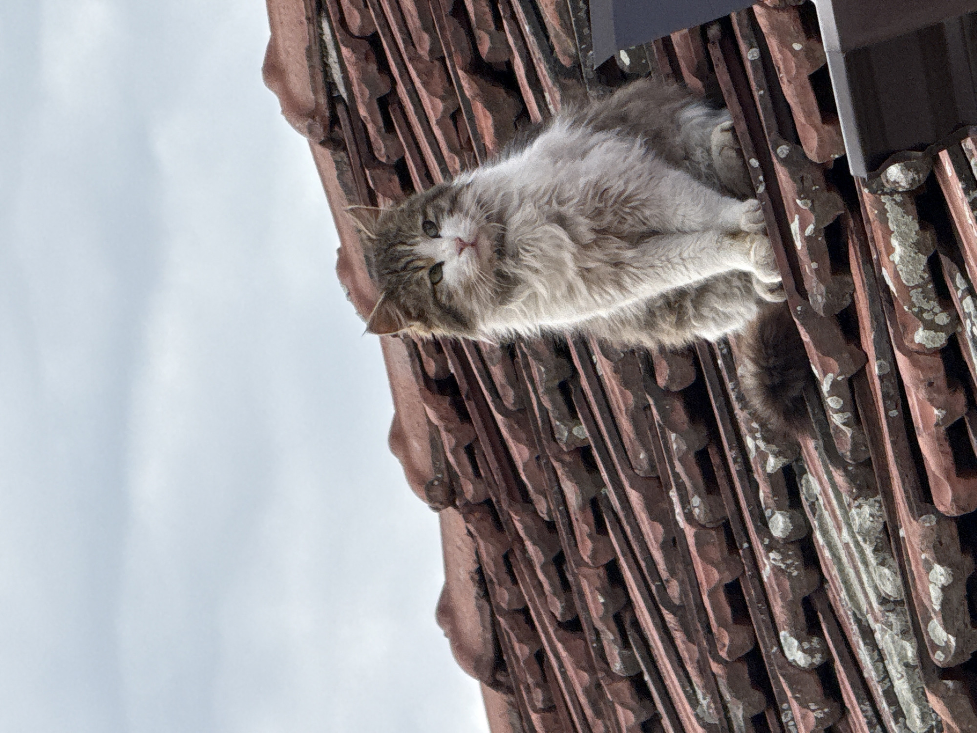 - "A gray and white long-haired cat is sitting on a red clay tile roof" by FM-GxyCn2, licensed under CC BY 4.0