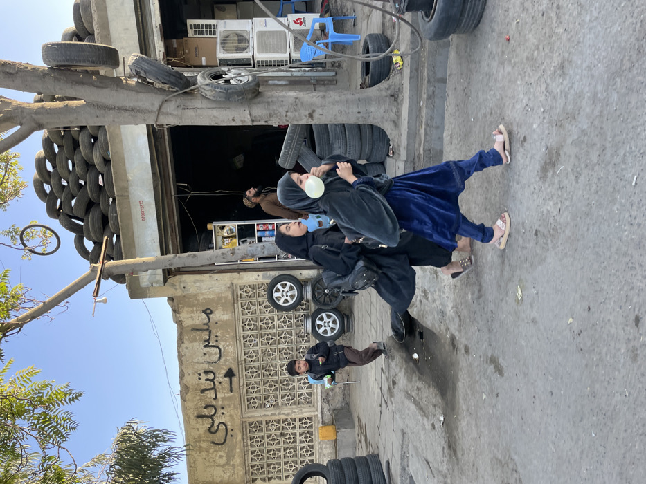 The scene depicts a daytime street in the city of Unknown, Unknown, featuring a commercial establishment and pedestrians. On the left, a light-colored building with a patterned concrete wall displays Arabic script that translates to "Tire Replacement" with an arrow pointing right. Several car rims are arranged near this structure. A young boy in a dark jacket and backpack walks left-to-right, holding a metal rod and a white object. Following him are two females: an adult woman dressed in a black abaya and hijab, carrying a black backpack, and a girl in a blue velvet-like top, blue pants, and a dark hijab, actively blowing a large, spherical gum bubble. Both females wear sandals. The concrete ground of the street exhibits stains and minor debris. To the right, an open-fronted tire service shop is visible. Its roof is heavily covered with stacked tires, and more tires are present inside the shop and hanging from a prominent tree in the foreground. Several white air conditioning units are stacked vertically next to the shop entrance, and a blue plastic chair is also outside. An adult male with a beard and head covering is observable within the shop, looking upwards and to the right. A telephone number, "07700753875", is inscribed on the shop's facade.