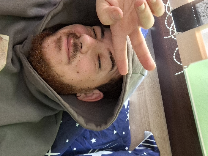 A male individual is depicted in an indoor setting in Rakitovo, Bulgaria. The subject, viewed from an elevated angle, is reclined and wears a gray hooded sweatshirt with the hood raised. He possesses a reddish-brown beard and mustache, with visible facial moles. His eyes are closed, and his mouth is slightly upturned in a smile. A small black hoop earring is present in his left ear. His left hand is positioned above his forehead, forming a peace sign with the index and middle fingers extended. Surrounding elements include blue bedding adorned with white star patterns, a dark brown wooden surface, a segment of a light green wall, and a white beaded string decoration. A dark, unidentified object is partially visible in the upper left background.