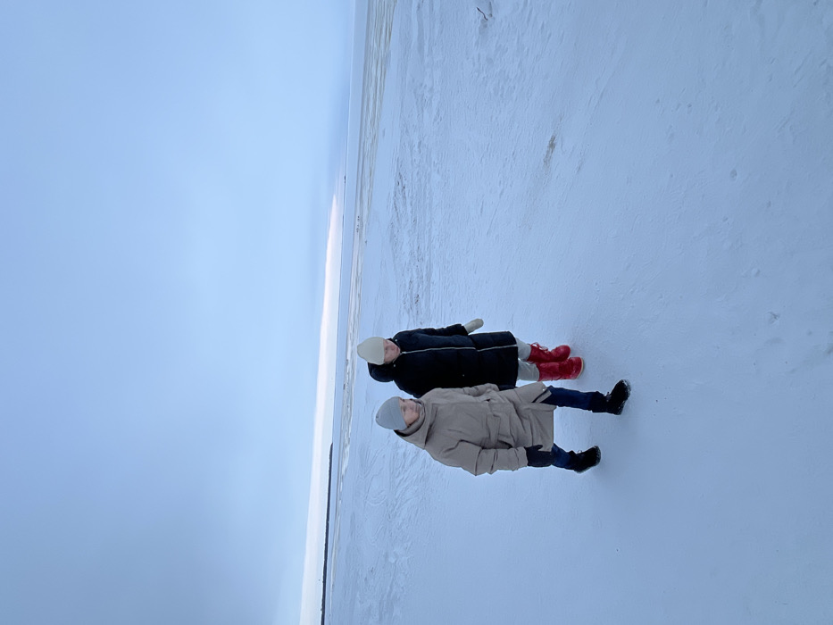 - "Two individuals wearing winter coats, knit hats, and boots are lying side-by-side on a snowy surface, possibly a frozen lake or field" by FM-4Mf512, licensed under CC BY 4.0