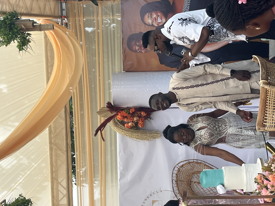 The image depicts an indoor or semi-outdoor celebratory event, likely a wedding reception, occurring in Kumasi, Ghana, under a light-colored draped canopy