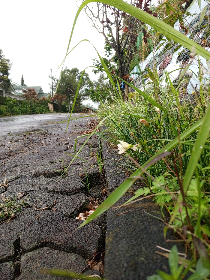 This image presents a low-angle view of a paved road or pathway in Ganwin, Liberia, under an overcast sky. The foreground on the left consists of a dark, textured paved surface, likely composed of interlocking pavers or damaged asphalt, exhibiting cracks and sporadic growth of small weeds. The surface appears damp or wet. To the immediate right, a dense strip of green vegetation, including various grasses and leafy plants, lines the edge of the pavement, bordered by a dark, possibly concrete, curb. Water droplets are visible on the foliage. A single white, trumpet-shaped flower blooms among the green plants in the mid-right. In the background on the left, several buildings with distinct green roofs are partially visible amidst dense trees and foliage; one structure features a pointed spire. On the right background, additional trees and a section of a colorful, possibly patterned, wall or fence are discernible behind the vegetation. No individuals or animals are present in the scene.