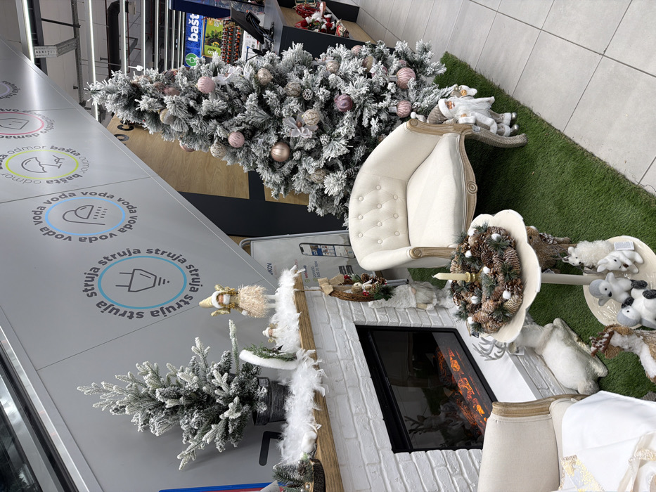 An indoor retail display in what appears to be an Okov store, located in Bar, Montenegro, presents a Christmas-themed arrangement