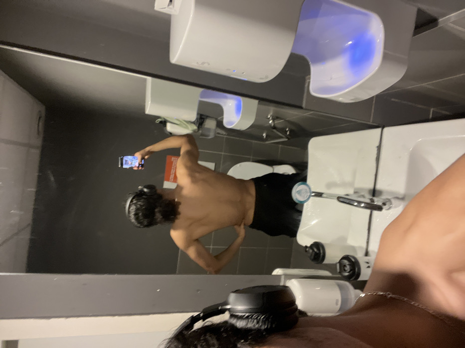 - "The image depicts a mirror selfie taken by a male individual in a modern gym restroom, located in Strasbourg, France" by FM-ebSzB3, licensed under CC BY 4.0