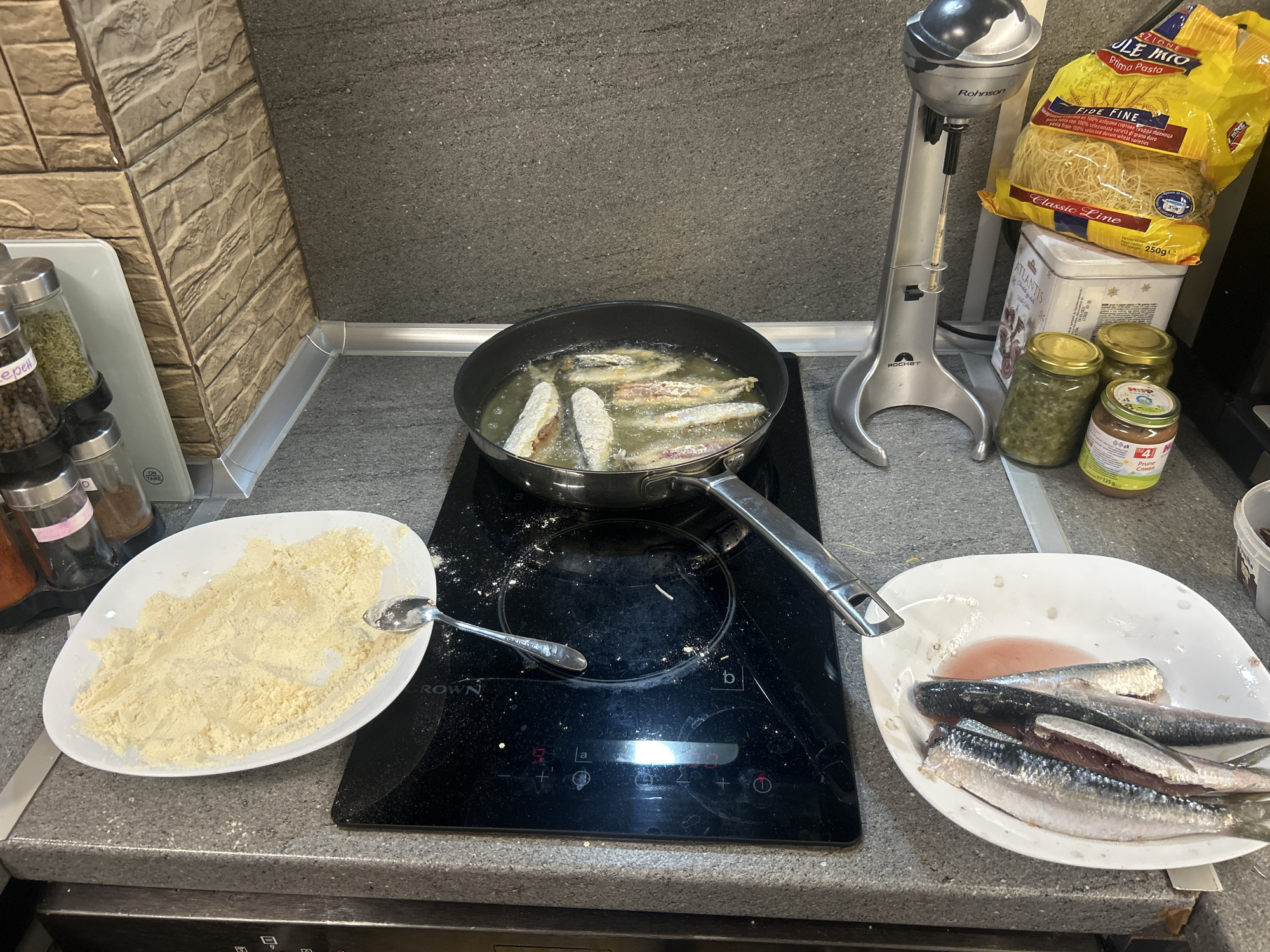 The scene depicts a domestic kitchen in Sofia, Bulgaria, actively engaged in the preparation of fried fish. A black induction cooktop, displaying power level "9" and an active zone "a", is central, its surface lightly dusted with flour. A black non-stick frying pan rests on the left burner, containing multiple small fish, partially coated in a light-colored breading, actively frying in bubbling hot oil. To the left of the cooktop, a white oval plate holds a substantial amount of light yellow flour or breading mixture, with a silver spoon resting within it. To the right, another white oval plate contains several raw, gutted small fish, displaying silver scales and exposed pinkish-red flesh, sitting in a small pool of reddish liquid. Behind the cooktop, a silver "Rohnson Rocket" stick blender stands upright. Adjacent to it are various food items: a yellow plastic bag of "Prima Pasta FIDE FINE Classic Line" noodles (250g), a white metal "Atlantis" tin, and three glass jars. Two jars contain green relish-like contents, while the third, larger jar, is labeled "MTP Пюре Сливи" (Plum Puree, 125g). On the far left, a clear spice rack holds several glass jars with silver lids, containing various dried herbs and spices, one label partially visible as "черен" (black, likely pepper). The countertop is a dark gray, speckled granite, contrasting with a beige, textured, stacked-stone-patterned backsplash on the left and a smooth dark gray wall on the right. The presence of prepared raw fish, flour, and actively frying fish indicates an ongoing cooking process.