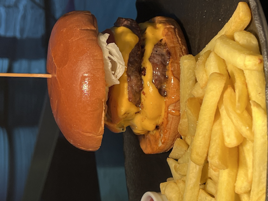 - "A cheeseburger with two beef patties, cheddar cheese, and lettuce is skewered with a wooden pick" by FM-T5Wdg1, licensed under CC BY 4.0