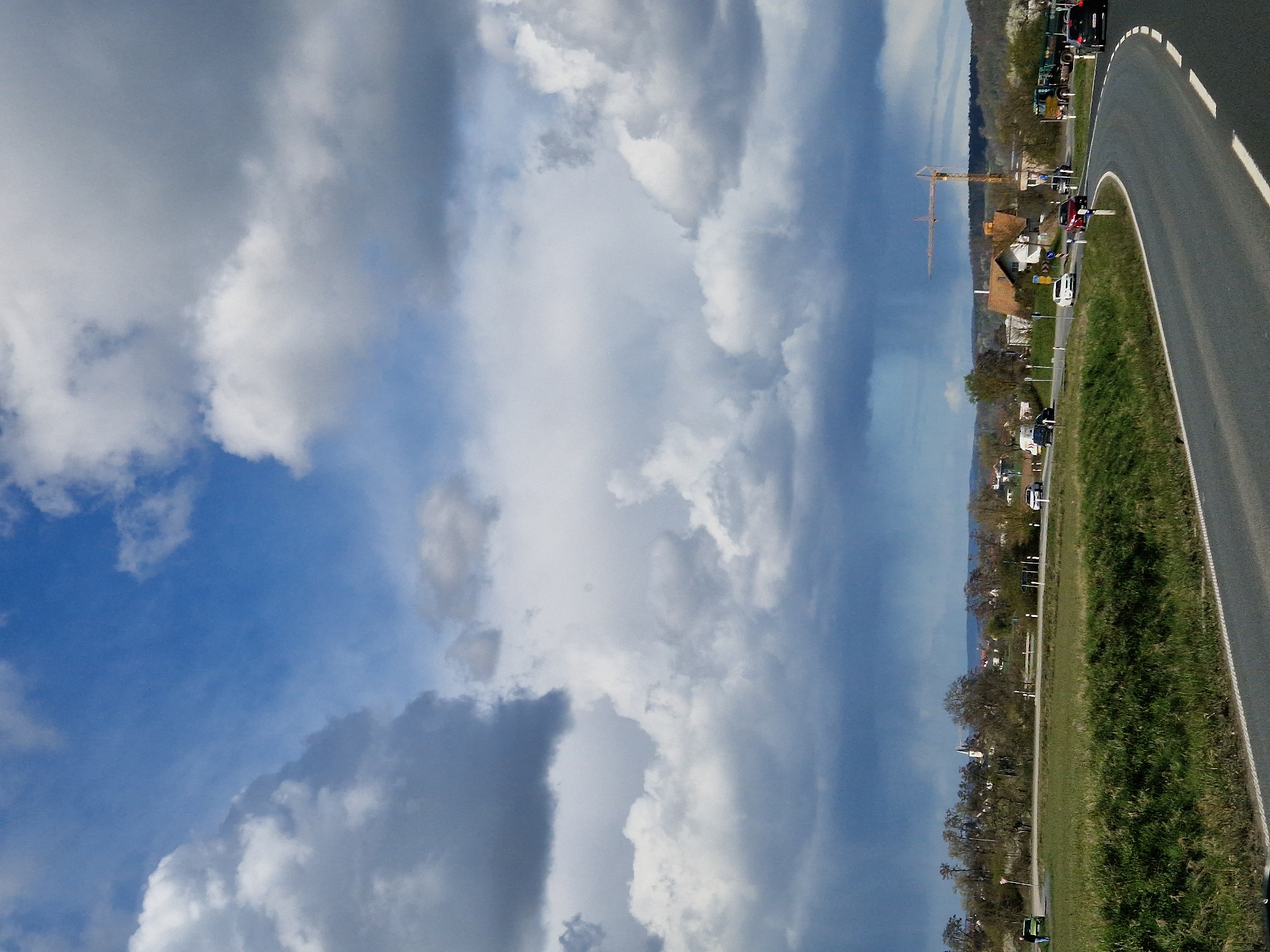 landscape scene near Elsenfeld, Germany, featuring a road curving along a green space with grass. In the background, there's a partially obscured view of a construction crane amid houses and trees, suggesting a residential area undergoing development. There are several vehicles on the road, and the sky is filled with a mix of blue and white clouds, indicating fair weather.