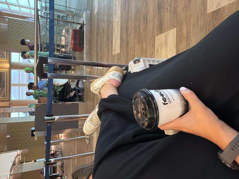 An individual in black clothing holds a cup from "Food Galleria by Meritus". A gray smartwatch is visible on their wrist. One foot wears a beige sneaker with pink accents. The setting appears to be an airport waiting area. Other seated people are visible through the window, and luggage can be seen on a trolley. The floor is a light-colored wood.