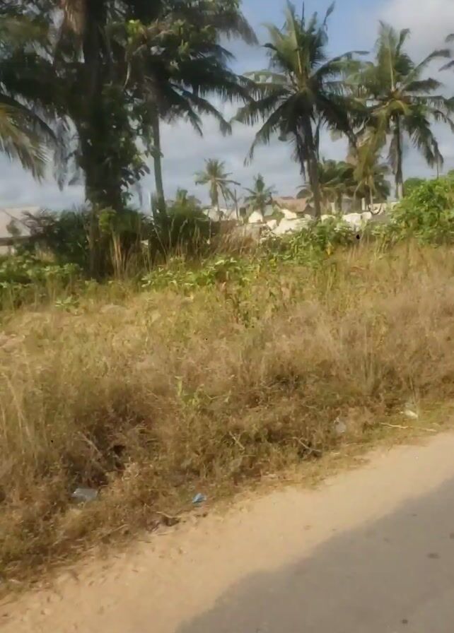A person is riding a motorcycle down a paved road, passing by palm trees and utility poles. The sky is cloudy. The person is wearing a yellow shirt. The camera appears to be mounted on the motorcycle and points forward.