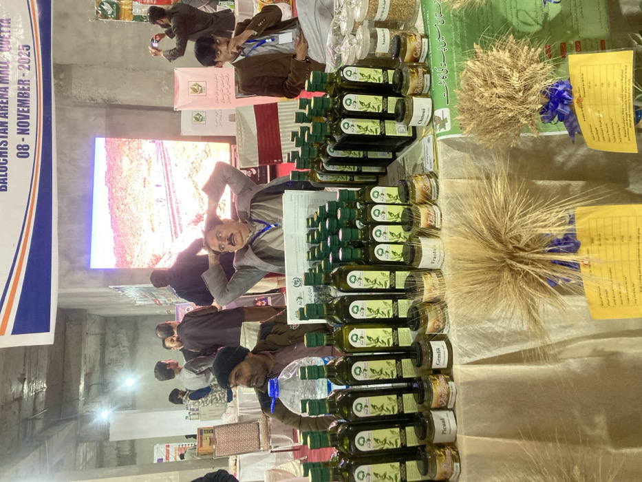 This image depicts an indoor exhibition booth at the "BALOCHISTAN ARENA MALL QUETTA" on "08 - NOVEMBER - 2025," located in Quetta City Tehsil, Pakistan. The venue features exposed concrete ceilings and pillars, with bright overhead lighting. A large digital screen in the background displays an image of a desert landscape containing a road. In the foreground, a display table draped with a light-colored fabric showcases rows of clear glass bottles with green caps, filled with a yellowish liquid and branded "Pak Olive." Below these bottles are numerous smaller glass jars, some labeled with terms such as "Picu," "Gemlik," "Frantoi," "Cheto," "Coratina," and "Samhoni." Bundles of dried wheat stalks, secured with blue ribbons, are also displayed on the table, accompanied by yellow information cards containing tabular data. Three adult males are seated directly behind the display table. The male on the left wears a dark cap and jacket, looking to his left, with a large clear plastic water bottle positioned beside him. The central male wears a light brown jacket over a light shirt, with a blue lanyard around his neck; his hands are clasped behind his head, and he gazes upward and left. The male on the right wears a brown jacket over a white garment, also with a blue lanyard, and is looking downward and to his right. In the mid-ground and background, additional individuals are observed standing and moving. One male on the far right is actively holding a smartphone horizontally, pointing it towards a display, suggesting photography. Green and white banners featuring a logo and Urdu text are visible behind the seated individuals. The scene indicates an event focused on the display and promotion of agricultural or food products, specifically olives and olive oil.
