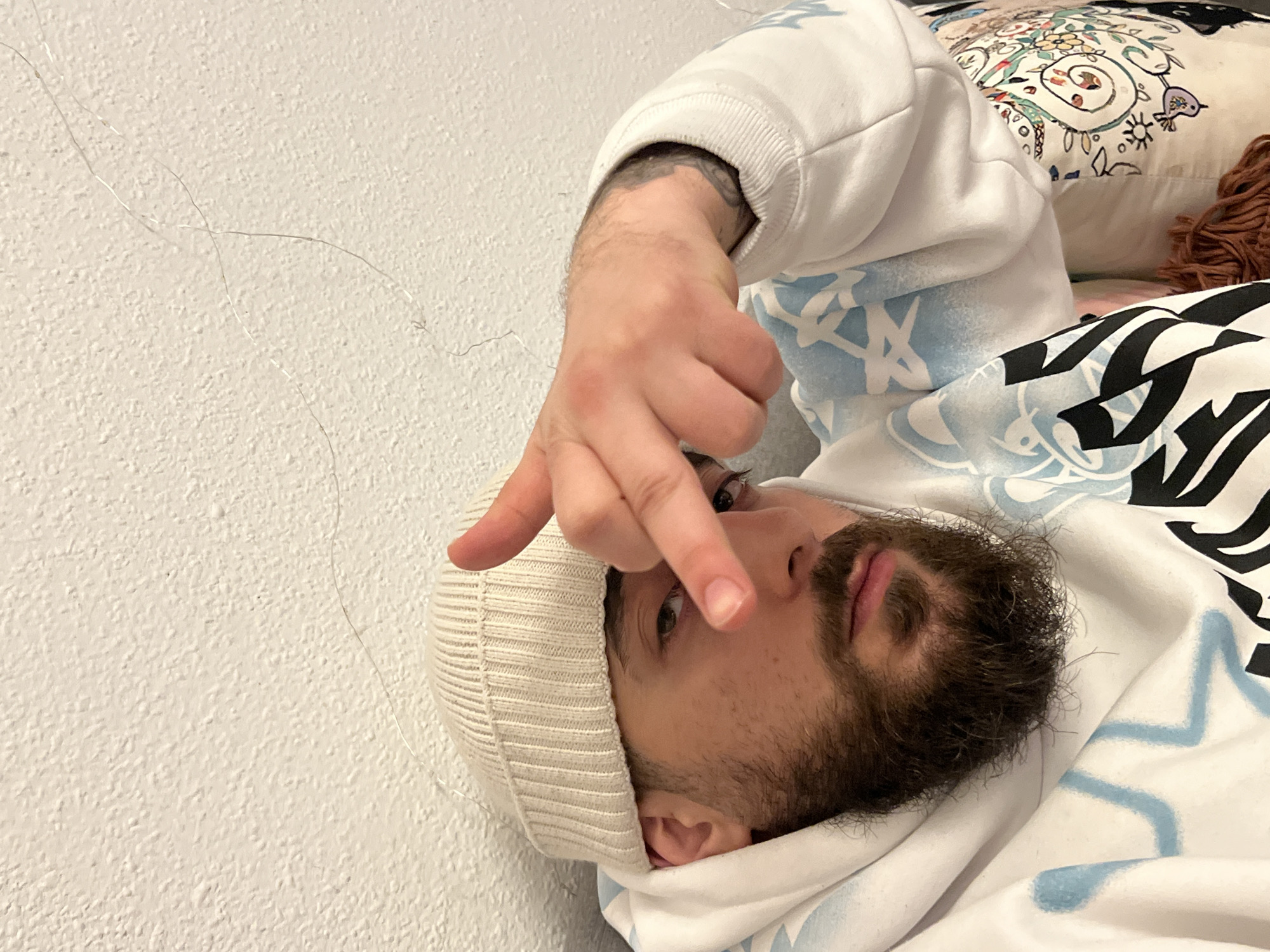 A man is lying on a bed, wearing a white beanie and a white hoodie with blue and black designs. He is holding up his hand with his index finger pointing downward. The background includes a white wall and pillows with various designs. The location in the city of Strasbourg, France is not discernible from the image.