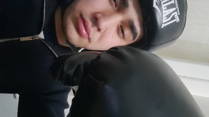 A man with a boxing headgear with the word "Everlast" is leaning towards the camera. He wears a black zip-up sweater. A black boxing glove is near his face. The background shows a white wall and a small portion of white stairs. The man has dark eyebrows, light skin, and a mole on his lip.
