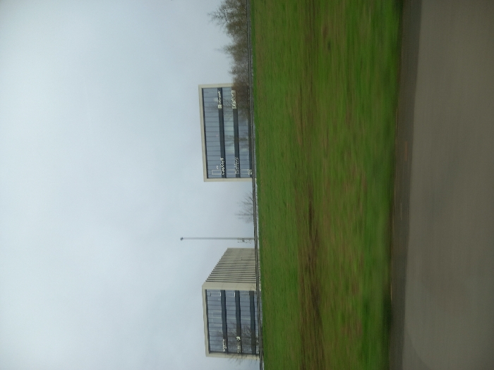The image depicts an outdoor scene in Waregem, Belgium, characterized by an overcast, light grey sky dominating the upper half of the frame. The lower portion of the image shows a dark grey asphalt road surface and an ascending green grassy embankment, both exhibiting horizontal motion blur. Perched atop the embankment, and partially obscured by bare deciduous trees, are two modern, multi-story rectangular office buildings. The building on the left features a light-colored facade with vertical ribbed panels on its right side and dark glass windows; white logos including "O-" and "Teamleader" are visible on its exterior. The building on the right, similar in construction with dark glass windows, displays the white logos "O-", "Microsoft", and "EASI" on its facade. A single, tall, slender grey utility pole stands between the two buildings. No individuals are present in the scene, and no discernible actions or interactions are occurring.
