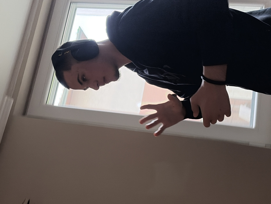 This image captures a young male subject in profile, facing right, indoors in the city of Bozhurishte, Bulgaria. He wears dark over-ear headphones and a dark long-sleeved hooded garment. A dark bracelet is present on his right wrist. His left hand is raised and open, fingers splayed, with his palm facing slightly towards the viewer. His right hand is clasped around his left wrist. The background features a plain, light-colored wall on the left and a white-framed window on the right, through which diffuse natural light enters the room. A blurred outdoor scene, including a building with a reddish roof or wall, is partially visible through the window.