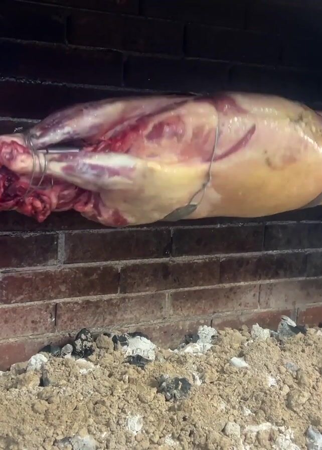 The video depicts a whole lamb being cooked on a rotisserie inside a brick oven