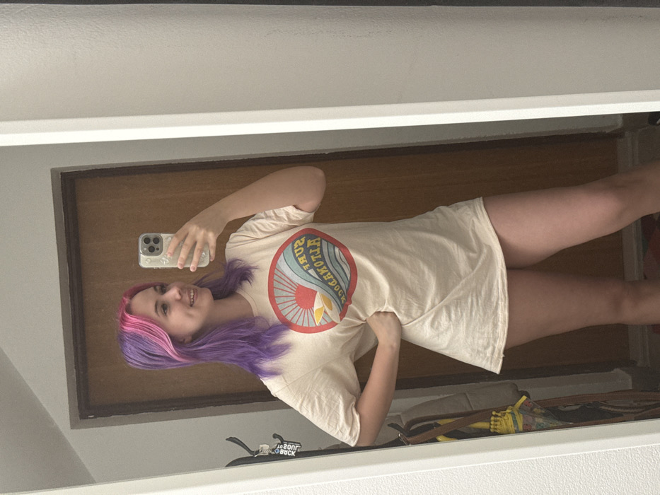 A young female individual is depicted in a full-body mirror selfie taken indoors, presumably within a residence in the City of Zagreb, Croatia. She is standing, angled slightly to her left, with her left hand placed on her hip. Her hair is medium length, featuring distinct pink highlights at the front and purple coloring throughout. She is smiling, revealing her teeth, and holding a smartphone with a light-colored, possibly patterned, case in her outstretched right hand to capture the image. She wears an oversized, light beige t-shirt adorned with a circular graphic depicting a sun, waves, and a surfboard, along with the reversed text "SURF ALL DAY LONG." The t-shirt extends to mid-thigh, leaving her legs bare. The background, visible in the mirror's reflection, consists primarily of a dark brown wooden door. To the left of the subject in the reflection, a black coat rack with keys and a partially visible bag or backpack hanging from it is present. The mirror has a white frame along its right edge.
