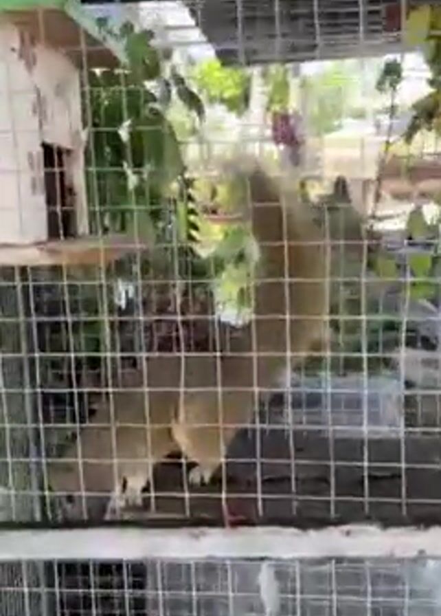 A medium, vertical shot shows two squirrels in a gray wire cage