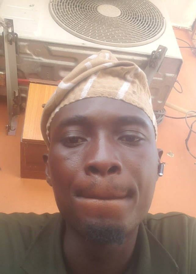 A man wearing a striped head covering and a green shirt stands in front of an air conditioning unit. The air conditioner is white and appears to be mounted on a wall. The man looks at the camera with a slight smile. There are wires and a small wooden shelf near the air conditioning unit. The wall behind the unit is orange.