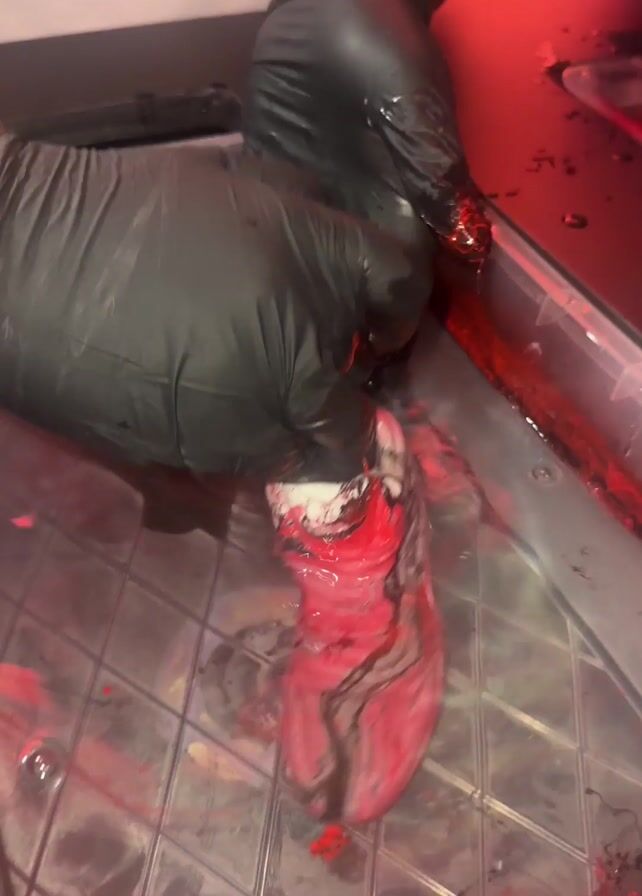 - "A pair of hands in black gloves are shown lifting a sneaker out of a clear, grid-lined tray filled with a red and black liquid" by FM-13LyK2, licensed under CC BY 4.0