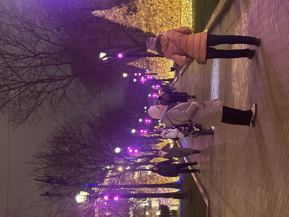 People stroll along a brick-paved pathway lined with trees. Bare branches reach into the twilight sky. The pathway is adorned with evenly spaced streetlamps, each emitting a purple glow. Along the pathway, there are displays of bright golden lights. Several individuals walk along the path, dressed in winter clothing.