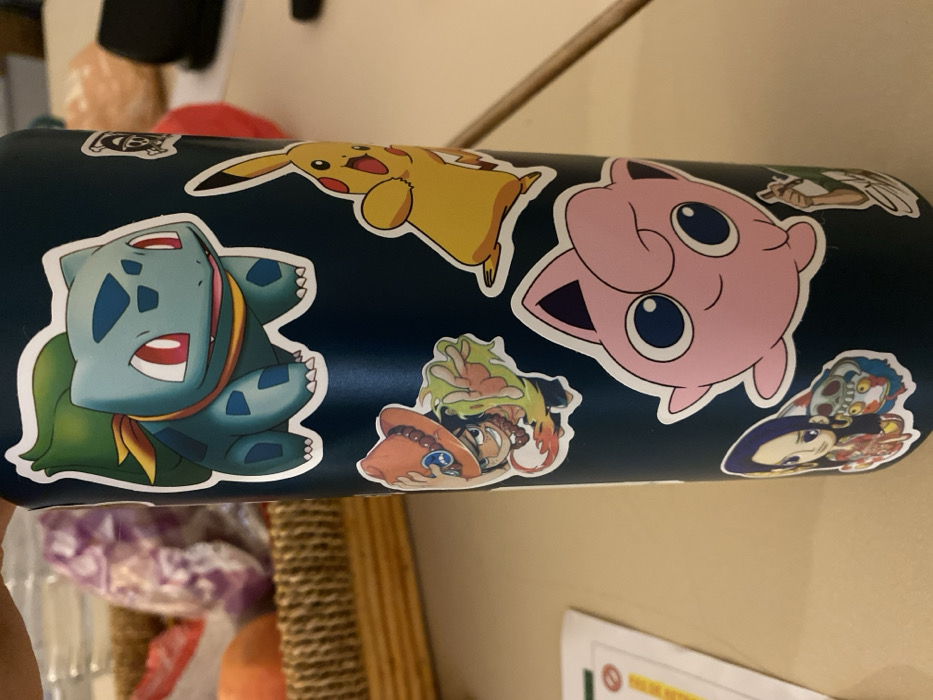 A dark blue water bottle covered in stickers. The stickers feature popular characters like Pikachu, Jigglypuff, and Bulbasaur from the Pokémon franchise. Other stickers include anime characters, like Ace from One Piece, and an image of a zombie. The bottle is sitting on a table with a cat tree in the background.