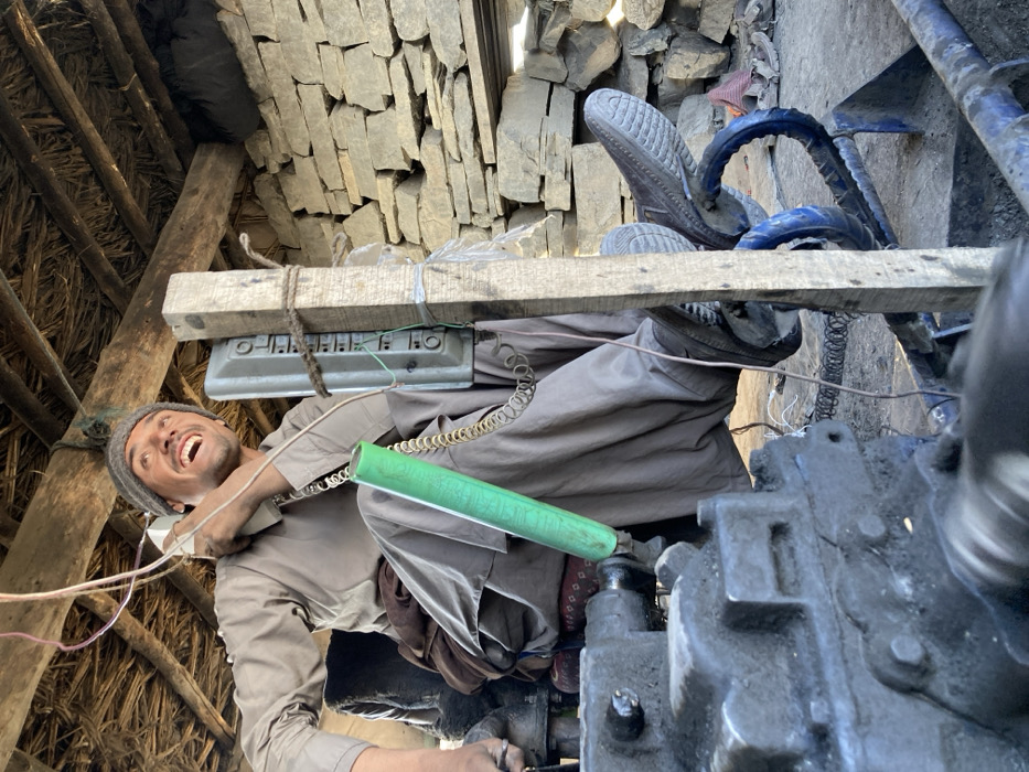 An adult male subject is depicted in Duki, Pakistan, seated and engaged in a telephone conversation. He wears a grey knitted beanie, a light tan long-sleeved tunic (kameez), and matching baggy trousers (shalwar). His right foot, clad in a dark shoe, rests on a blue curved metal support structure. He holds a white corded telephone receiver to his right ear and mouth, looking upwards and to the right with an open-mouthed, smiling expression. A grey rectangular telephone unit with vertical buttons is secured to a rough-hewn wooden post with rope and plastic, positioned to the subject's right. A coiled telephone cord connects the receiver to this unit. In the lower left foreground, a section of a dark, oil-stained industrial machine is visible. The immediate environment is a rustic shelter featuring a thatched roof composed of straw or reeds supported by wooden beams. To the right of the subject, a wall constructed from irregularly shaped, dry-stacked stones is present. Multiple loose electrical wires traverse the upper section of the frame and around the telephone setup.
