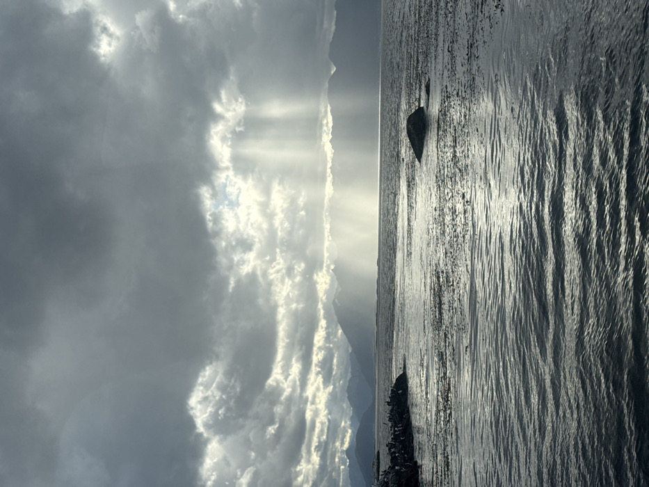 This image depicts a coastal landscape in Argentina, consistent with the Beagle Channel region in Tierra del Fuego. While no specific city is discernible within the frame, the environment is characterized by a wide body of water in the foreground and mid-ground, framed by a distant mountain range along the horizon. The sky is largely overcast with dense, dark grey clouds, from which multiple distinct shafts of crepuscular light descend towards the water and mountains in the right-center. The distant mountain range is dark and rugged, partially silhouetted against the illuminated sky. The water in the foreground is dark and rippled, reflecting ambient light in silvery streaks, and contains numerous patches of dark marine vegetation, identified as seaweed or kelp, scattered across its surface. On the left side of the frame, a dark, rocky outcrop emerges from the water, densely populated by dozens of dark-feathered birds, consistent with cormorants, in a resting posture. In the mid-ground to the right, a solitary, dark, rounded rock protrudes from the water. No human figures or direct human actions are visible.