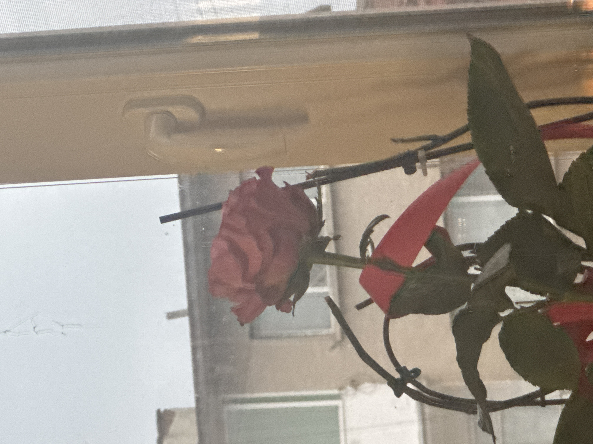 faded red rose leaning against a window. Outside the window, blurred shapes suggest a building. There are red, ribbon-like decorations entangled with the rose stem. The window appears to be in need of cleaning, with streaks visible on the glass. There are some window closing parts are visible on the top of the window. The location in Pleven, Bulgaria is undetermined from the image.