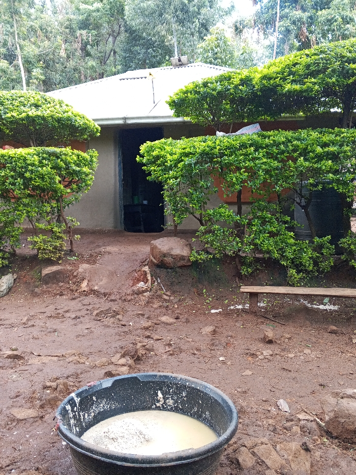 The scene depicts an outdoor area in the city of Getenga ward, Kenya, under diffused lighting. In the foreground, a black plastic basin holds a milky-white liquid mixed with granular solid material. The ground is composed of damp, reddish-brown soil, appearing muddy and disturbed, with scattered small rocks and debris. A worn earth path leads towards a building entrance, framed by two large, dark brown boulders. Manicured green hedges line this path, extending towards the structure. To the right, partially obscured by a hedge, a weathered wooden bench with dark supports is visible. The background features a single-story building with light-colored, possibly beige or grey, stuccoed walls and a corrugated metal roof equipped with a rain gutter. The building's entrance is an open, dark doorway, revealing indistinct objects within. Dense green tree foliage forms a natural backdrop beyond the building. No individuals, actions, or interactions are observed within the frame.
