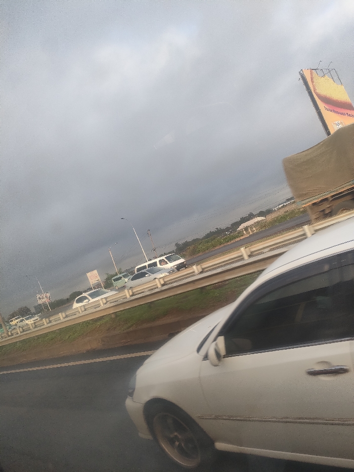 The image captures an overcast daytime scene on a multi-lane highway within Murera ward, Kenya, viewed from the interior of a moving vehicle