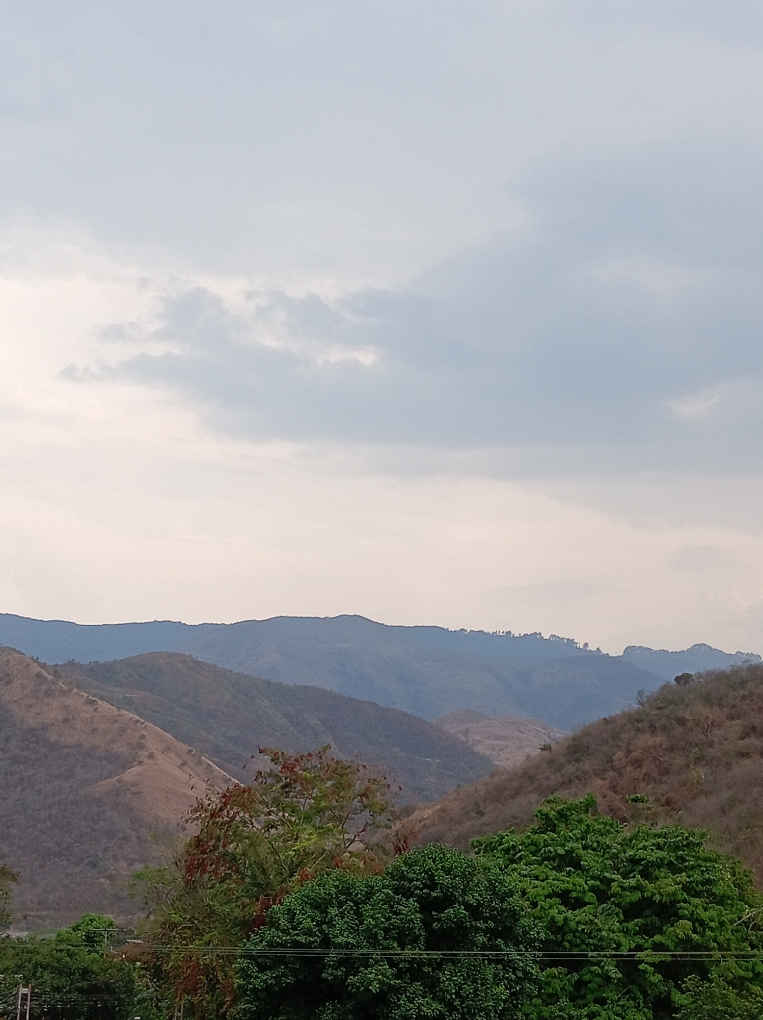 landscape in Las Tejerías, Venezuela. Several layers of mountains recede into the distance. The mountains closer to the viewer are drier and sparsely vegetated, while those further away are a hazy blue. The sky is overcast with a layer of clouds. In the foreground are green trees. There are power lines running along the bottom of the image. The image appears to have been taken from a relatively low vantage point, possibly within the town itself.