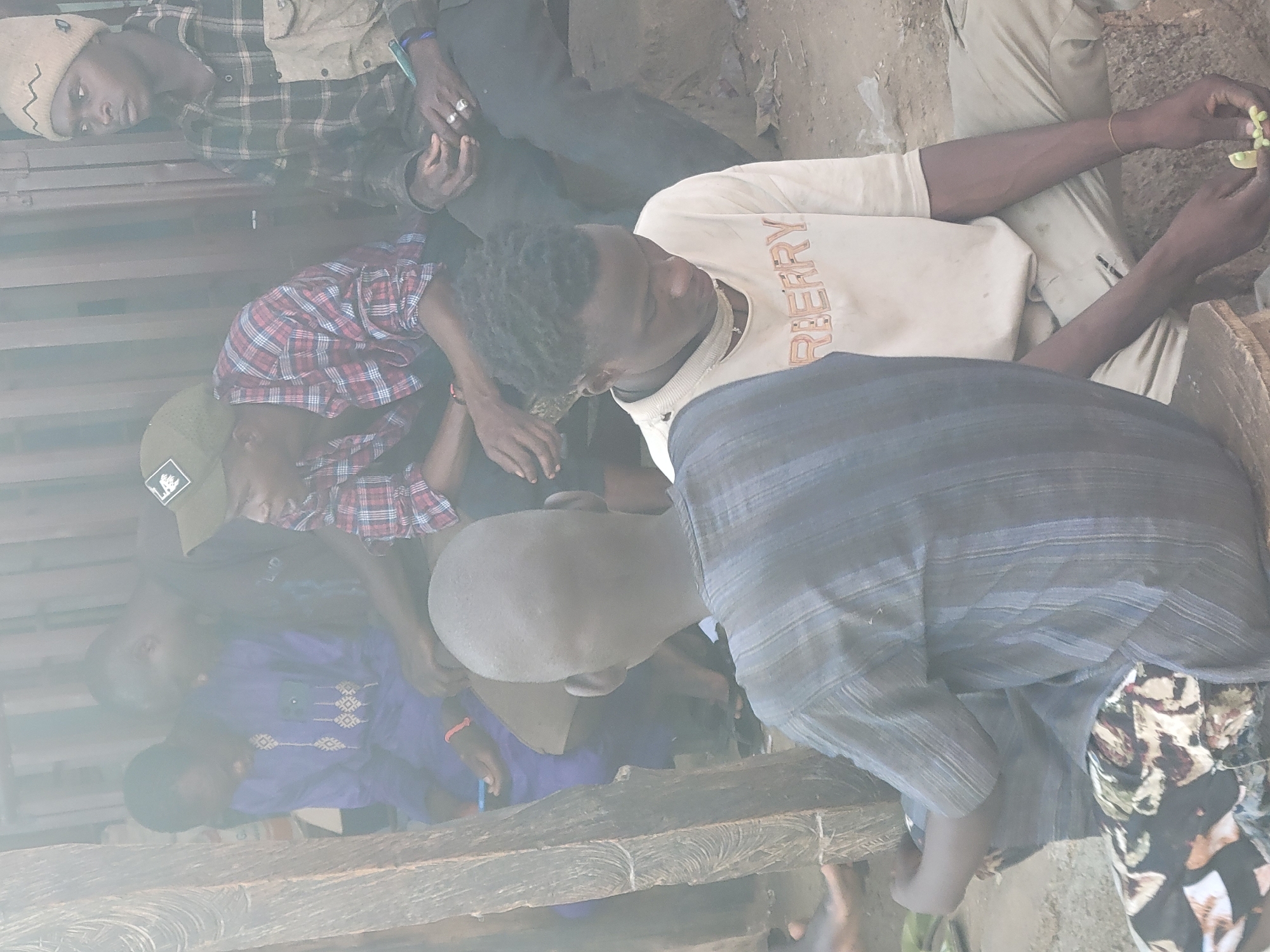 In Madalla, Nigeria, a group of men are seated on a wooden structure in an outdoor setting. One man wears a white t-shirt with "Burberry" printed on it and is examining something small and green in his hands. Another man is wearing a red and blue checkered shirt. Additional men are wearing a patterned purple garment and a tan hat, with the rest of their outfits obscured. The background appears to be a combination of sandy ground and partial walls. The overall scene is somewhat obscured by haze.